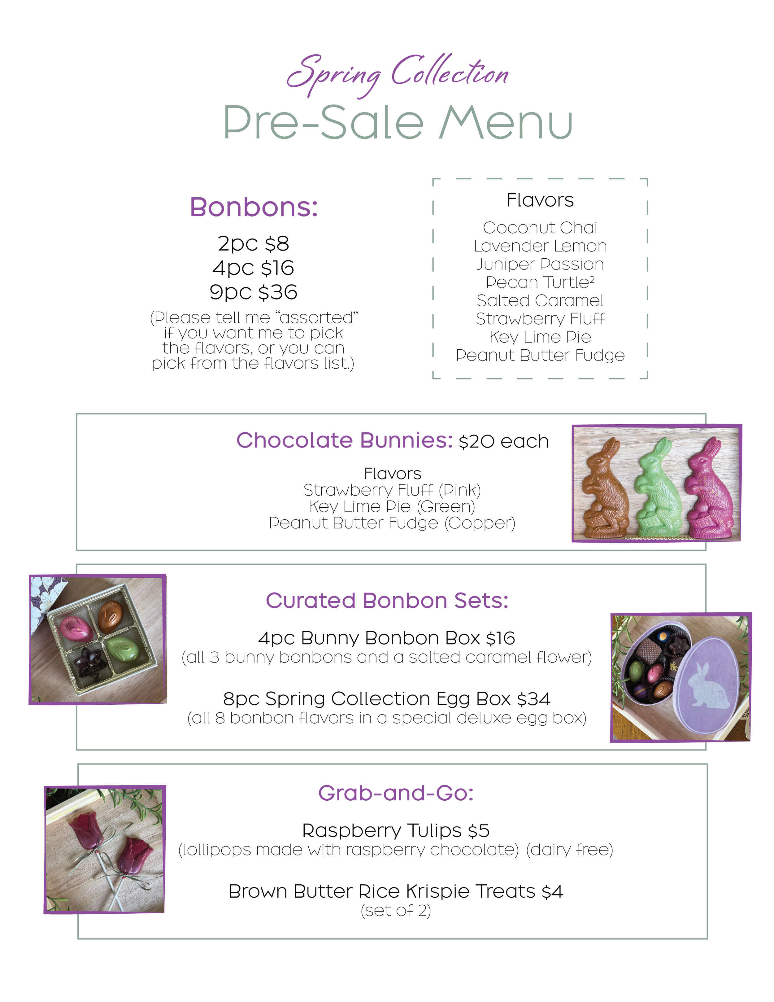 To submit a Pre-Sale order, please email info@juniperchocolate.com or DM me on Instagram with your name and order. Pick-up and payment will be at the market on March 28. I will have it bagged and ready to go for you!